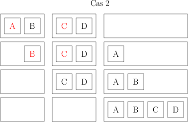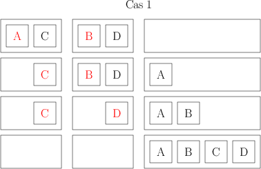 Ensuite, je prends mes ensembles de deux livres, et je les combine aussi de façon à avoir des ensembles de 4 livres, toujours ordonnées. Pour faire ça, je compare les deux premiers livres de deux ensembles, le plus petit des deux devient le premier livre de mon nouvel ensemble de 4. Je compare ensuite le livre restant de l’ensemble de 2 avec le premier livre de l’ensemble de 2, et je mets le plus petit en 2e position de mon ensemble de 4. Là, il peut se passer deux choses. Ou bien il me reste un livre dans chacun des ensembles initiaux ; auquel cas, je les compare, et je les mets dans l’ordre dans mon ensemble de 4. Ou bien il me reste un ensemble de deux ; je peux alors me contenter de les ajouter à la fin de mon ensemble de 4 et j’ai mon ensemble de 4. Voilà deux petits dessins qui distinguent les deux cas ; chaque carré représente un livre dont l’auteur a un nom commençant par la lettre indiquée, chaque rectangle représente mes ensembles de livres (les initiaux de 2 et le final de 4 livres), et les éléments rouges sont ceux qui sont comparés à chaque étape.