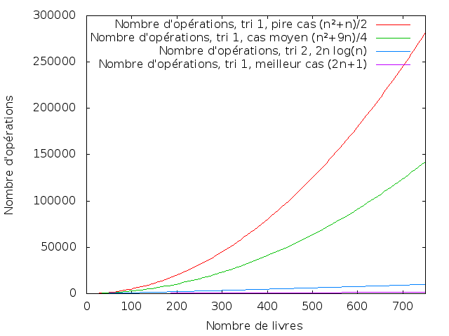 • pour le « premier » tri, celui où je regarde à chaque étape où je dois mettre le livre suivant en parcourant tous les livres que j’ai mis jusqu’ici, j’ai, dans le meilleur des cas, 2n – 1 opérations, dans le pire des cas (n² + n)/2 opérations, et dans le cas moyen (n²+9n)/4 opérations.