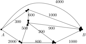On a le point A, le point B, quelques points intermédiaires reliés par des tuyaux, et la capacité de chaque tuyau est indiquée sur chaque tuyau. Sur un « petit » réseau comme celui-ci, on peut s’en sortir en regardant très fort le schéma et en tentant de répartir l’eau au maximum dans les tuyaux de façon à ce qu’aucun tuyau ne soit en surcapacité, sinon ça explose et ça fait désordre (spoiler : sauf erreur grossière de ma part, on arrive avec ce réseau à 5600 litres par seconde).