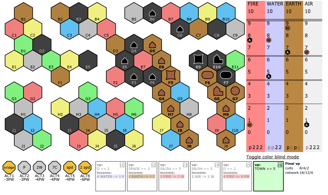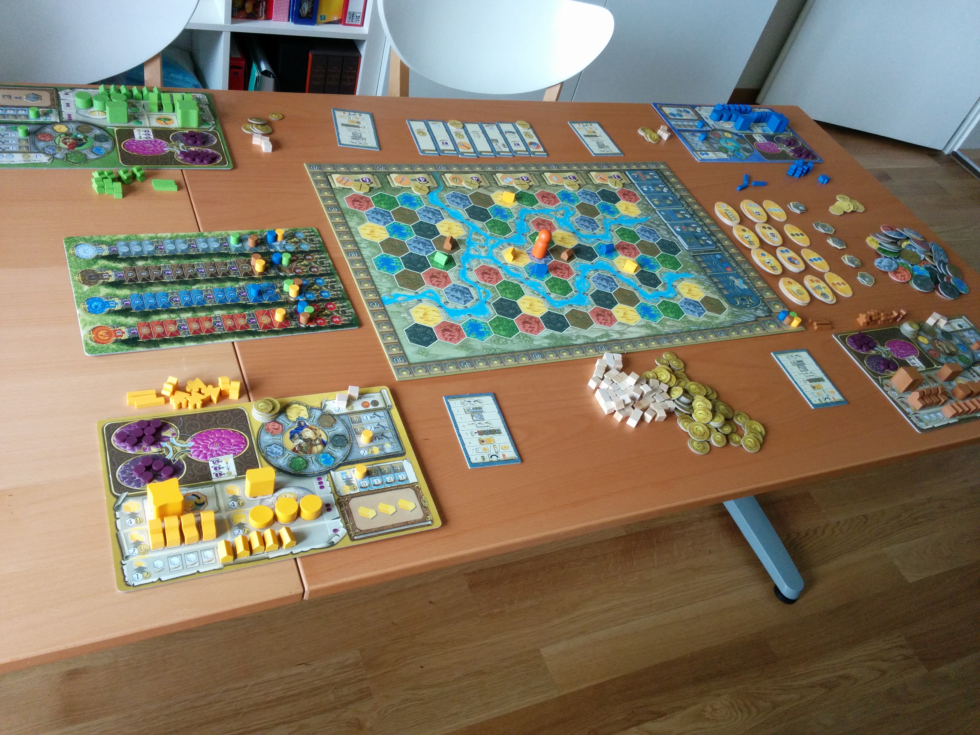 Fertility, Catch Up Games – un jeu qui se passe en Égypte, on place des tuiles, on récupère et on gère des ressources, on collectionne des Dieux anciens un peu comme des Pokémon, et à la fin on se rend compte qu’on a joué trop de tours parce qu’on jouait à deux et qu’il fallait retirer des tuiles de la pile avant de commencer. J’ai bien aimé, mais les composants en bois qui font les ressources m’ont paru trop petits (bien qu’adaptés à la taille du jeu et des emplacements), et Pierre a moins accroché.