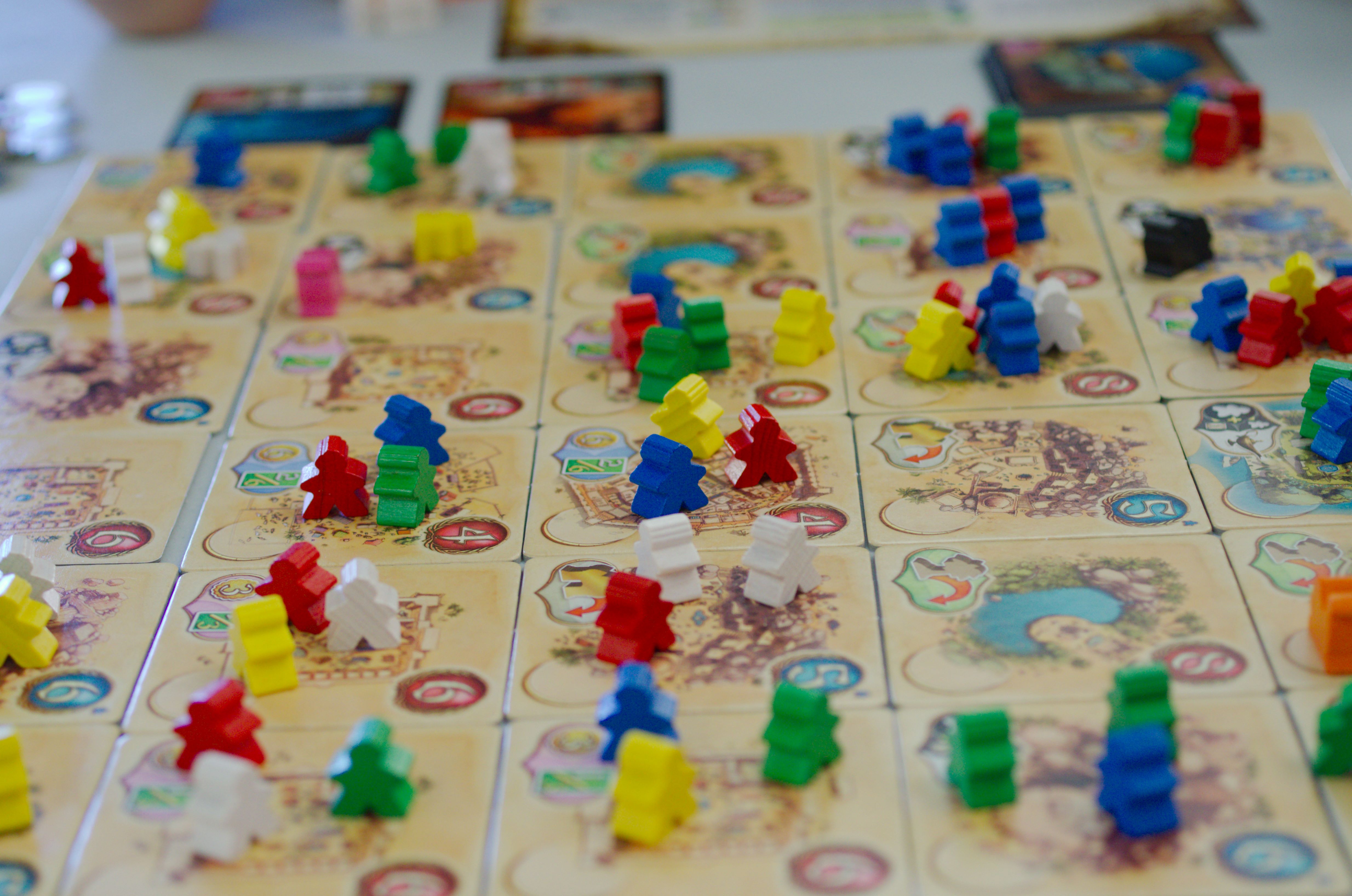 Cuzco, Super Meeple – une réimplémentation d’un jeu plus ancien nommé Java, dans lequel les joueurs cherchent à gagner le contrôle des villes qui se construisent au fil du jeu (et des temples y afférent). Un certain côté Taluva, rappelé principalement par le placement des tuiles sur plusieurs niveaux, à la fois moins agressif (parce qu’on peut pas faire péter des volcans sur les villages de ses petits camarades) et plus agressif (parce que le contrôle des territoires l’est beaucoup plus). J’ai plutôt bien aimé, mais je crois que c’est plausiblement un peu trop agressif pour moi ? Je sais pas trop. Et c’est le dernier jeu qu’on a testé ce jour là, et on s’est pas vraiment décidé ni dans un sens ni dans l’autre. J’y rejouerais bien.