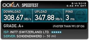 Bon, la première observation, c’est évidemment « mouahahahahahahahahah ». La deuxième observation c’est qu’on est un peu loin du giga, quand même. Fiber7 a tout un tas d’explications en allemand qui vont de « oui mais alors c’est pas impossible que ça sature EN FACE » à « si votre câble réseau est moisi ou si vous faites ça sur wifi, FORCÉMENT ça marche moins bien » en passant par « au fait, le modem qu’on vous refile et dans la config qu’on vous refile, au mieux il tape le 600M. Ça reste un bon bidule et si vous voulez vraiment taper plus collez-le en bridge et basta ». En pratique, je vois pas bien ce que je ferais avec 1G symétrique que je pourrais pas faire avec 300M symétrique (ce qui est quand même pas loin de vingt fois ce qu’on avait en down jusqu’ici…), alors j’ai pas trop investigué pour l’instant. Ni testé beaucoup, il faut le dire, pour de basses raisons matérielles.